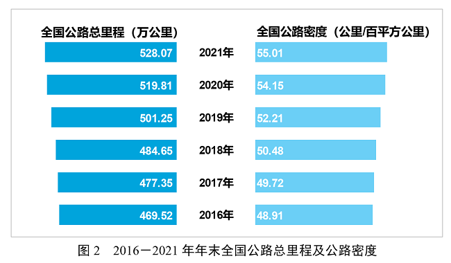 年末全國公路總里程528.07萬公里,比上年末增加8.26萬公里。公路密度55.01公里/百平方公里,增加0.86公里/百平方公里。公路養(yǎng)護里程525.16萬公里,占公路總里程比重為99.4%。
