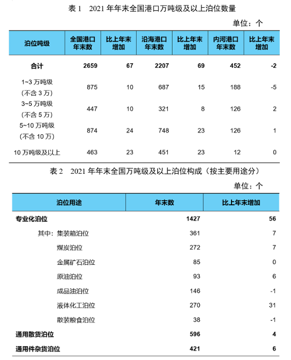 年末全國港口萬噸級及以上泊位2659個,比上年末增加67個。從分布結(jié)構(gòu)看,沿海港口萬噸級及以上泊位2207個、增加69個,內(nèi)河港口萬噸級及以上泊位452個、減少2個。從用途結(jié)構(gòu)看,專業(yè)化萬噸級及以上泊位1427個、增加56個,通用散貨萬噸級及以上泊位596個、增加4個,通用件雜貨泊位421個、增加6個。