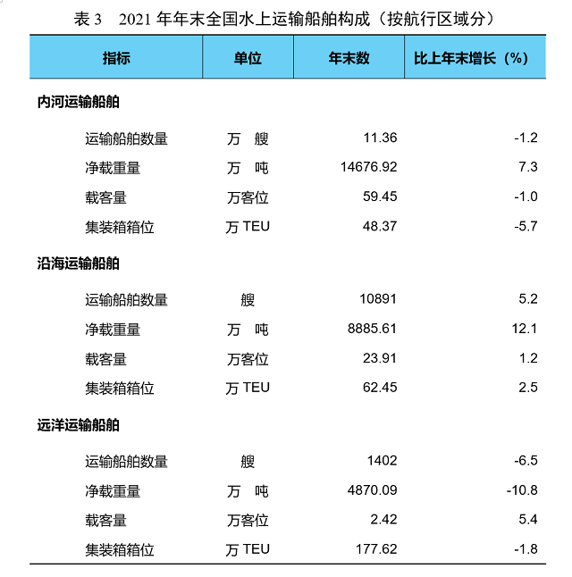 年末全國擁有水上運輸船舶12.59萬艘,比上年末下降0.7%,其中凈載重量28432.63萬噸、增長5.1%,載客量85.78萬客位、下降0.3%,集裝箱箱位288.43萬標(biāo)準(zhǔn)箱、下降1.6%。