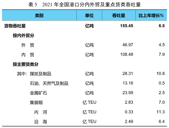 全年全國港口完成貨物吞吐量155.45億噸,比上年增長6.8%。其中,內(nèi)河港口完成55.73億噸、增長9.9%,沿海港口完成99.73億噸、增長5.2%。完成集裝箱鐵水聯(lián)運量754萬TEU,增長9.8%。