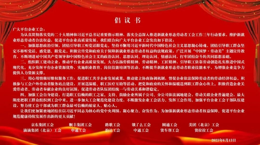 會上,京東、順豐、美團、滴滴、餓了么和滿幫集團旗下貨車幫等12家頭部平臺企業(yè)工會聯(lián)合發(fā)出倡議,呼吁廣大平臺企業(yè)落實全總“三年行動”要求,維護新就業(yè)形態(tài)勞動者合法權(quán)益,促進企業(yè)高質(zhì)量發(fā)展。