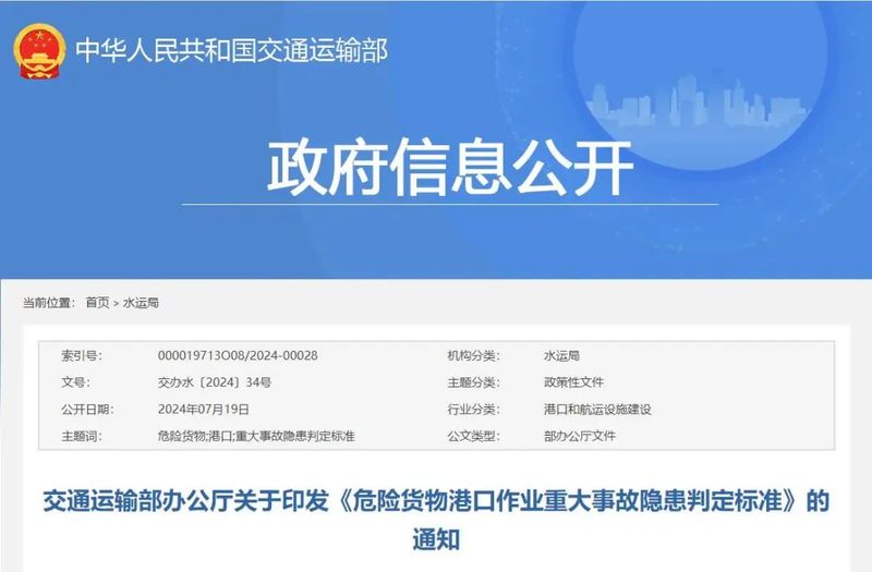 《危險貨物港口作業(yè)重大事故隱患判定標準》 解讀 一、有關背景 2016年,我部制定印發(fā)了《危險貨物港口作業(yè)重大事故隱患判定指南》(交水辦〔2016〕178號)(以下簡稱《判定指南》),有效指導了各地排查治理危險貨物港口作業(yè)重大事故隱患工作。近些年來,我部相繼制修訂了《港口危險貨物安全管理規(guī)定》等規(guī)章及政策文件,推動發(fā)布了港口作業(yè)安全要求多項強制性國家標準,對危險貨物港口作業(yè)提出了新要求;同時,《判定指南》在實施過程中有的地方也出現(xiàn)了個別條款理解不精準、針對性不突出、主觀擴大認定等情況。 按照國務院安委會《安全生產(chǎn)治本攻堅三年行動方案(2024—2026年)》及部相關部署要求,我部在原《判定指南》基礎上組織研究制定了《危險貨物港口作業(yè)重大事故隱患判定標準》(以下簡稱《判定標準》)。 二、主要修訂內容 《判定標準》維持原《判定指南》框架結構不變,從超范圍超能力超期限作業(yè)、設備設施不滿足作業(yè)安全要求、安全設施配備不滿足作業(yè)安全要求、安全距離(間距)不符合規(guī)定、安全管理存在重大缺陷等五個方面規(guī)定了25項重大事故隱患情形。主要修訂內容如下。 一是增強標準的操作性和實用性。修改完善了防火、防爆、防雷、防靜電等方面可操作性不強的相關內容。 二是突出重點領域隱患排查。重點針對危險貨物作業(yè)場所的消防控制室、中心控制室和構成一級、二級重大危險源罐區(qū)等細化了重大事故隱患判定要求。 三是突出防范新風險、解決新問題。重點從全員安全生產(chǎn)責任制、雙重預防機制、高風險作業(yè)區(qū)域人員行為管理、儲罐浮盤落底作業(yè)、動火作業(yè)等方面補充了相關內容。 各省、自治區(qū)、直轄市交通運輸廳(委): 為貫徹落實習近平總書記關于安全生產(chǎn)的重要論述,深入排查治理危險貨物港口作業(yè)重大事故隱患,根據(jù)《中華人民共和國安全生產(chǎn)法》《中華人民共和國港口法》《危險化學品安全管理條例》《港口經(jīng)營管理規(guī)定》《港口危險貨物安全管理規(guī)定》等有關法律法規(guī)規(guī)章和標準,我部組織編制了《危險貨物港口作業(yè)重大事故隱患判定標準》,現(xiàn)印發(fā)給你們,請遵照執(zhí)行。執(zhí)行中的重要情況,請及時向部水運局反映。 交通運輸部辦公廳 2024年7月8日 (此件公開發(fā)布) 危險貨物港口作業(yè)重大事故隱患判定標準 第一條 為了準確判定、及時消除危險貨物港口作業(yè)重大事故隱患(以下簡稱重大事故隱患),根據(jù)《中華人民共和國安全生產(chǎn)法》《中華人民共和國港口法》《危險化學品安全管理條例》《港口經(jīng)營管理規(guī)定》《港口危險貨物安全管理規(guī)定》等法律、行政法規(guī)、規(guī)章和交通運輸部有關安全生產(chǎn)事故隱患治理的規(guī)定,制定本標準。 第二條 本標準適用于危險貨物港口經(jīng)營人港口作業(yè)重大事故隱患判定工作。 第三條 危險貨物港口作業(yè)重大事故隱患包括以下5個方面: (一)存在超范圍、超能力、超期限作業(yè)情況,或者危險貨物存放不符合作業(yè)安全要求的; (二)危險貨物港口作業(yè)設備設施不滿足作業(yè)安全要求的; (三)危險貨物港口作業(yè)場所的安全設施配備不滿足作業(yè)安全要求的; (四)危險貨物港口作業(yè)場所或儲運設備設施的安全距離(間距)不符合規(guī)定的; (五)安全管理存在重大缺陷的。 第四條 “存在超范圍、超能力、超期限作業(yè)情況,或者危險貨物存放不符合作業(yè)安全要求的”重大事故隱患,是指有下列情形之一的: (一)超出《港口經(jīng)營許可證》《港口危險貨物作業(yè)附證》許可范圍從事易燃易爆、毒性、放射性等危險特性的危險貨物作業(yè)的; (二)超出儲罐的設計溫度、壓力、液位儲存危險貨物或者超出介質儲存溫度儲存危險貨物,且未及時處理的;超出管道的設計溫度、壓力輸送危險貨物或者超出介質的輸送溫度、安全流速輸送危險貨物,且未及時處理的; (三)危險貨物作業(yè)碼頭按照有關規(guī)定檢測評估后,明確應當停止或者限制使用,但未停止或者限制使用的;港口危險貨物儲罐經(jīng)檢查、檢測,不具備安全生產(chǎn)條件,但未停止使用的;使用國家明令淘汰或者已經(jīng)報廢的港口大型裝卸機械的; (四)《危險貨物分類和品名編號》(GB 6944)和《國際海運危險貨物規(guī)則》規(guī)定的1.1項、1.2項爆炸品和硝酸銨類物質的危險貨物集裝箱未按照規(guī)定實行直裝直取作業(yè)的; (五)《危險貨物分類和品名編號》(GB 6944)和《國際海運危險貨物規(guī)則》規(guī)定的第1類爆炸品(除1.1項、1.2項以外)、第2類氣體和第7類放射性物質的危險貨物集裝箱超時、超量等違規(guī)存放的; (六)危險貨物未根據(jù)理化特性和滅火方式分區(qū)、分類、分庫隔離儲存的;危險貨物的隔離間距、堆存高度、堆存數(shù)量不符合規(guī)定,或者存在禁忌物違規(guī)混存情況的。 第五條 “危險貨物港口作業(yè)設備設施不滿足作業(yè)安全要求的”重大事故隱患,是指有下列情形之一的: (一)液體散貨碼頭裝卸設備與管道未按裝卸及檢修要求設置排空系統(tǒng),或者排空系統(tǒng)功能失效的;裝卸甲、乙類散裝液體