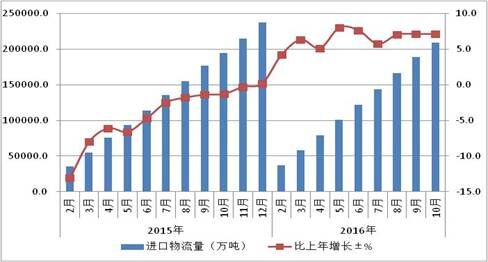 ---進(jìn)口物流需求小幅回暖。1-10月,進(jìn)口物流總額8.3萬(wàn)億元,比上年同期下降1.8%,降幅繼續(xù)收窄,比前三季度收窄0.5個(gè)百分點(diǎn)。進(jìn)口物流量增速保持平穩(wěn)增長(zhǎng),比上年同期增長(zhǎng)7.1%,增速與前三季度基本持平。從當(dāng)月情況看,10月當(dāng)月進(jìn)口物流總額0.9萬(wàn)億元,增長(zhǎng)3.2%,增速比上月加快1.0個(gè)百分點(diǎn)。