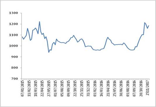 圖 1 2015-2016年各周中國(guó)公路物流運(yùn)價(jià)指數(shù)