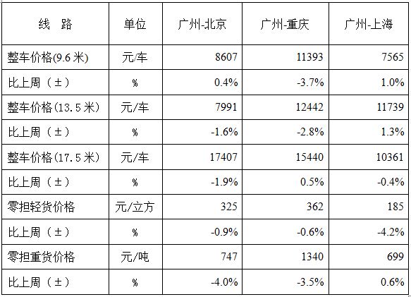 各車(chē)型指數(shù)環(huán)比均有不同程度回落,但各車(chē)型均高于上年同期水平。其中,整車(chē)指數(shù)為1101.7點(diǎn),環(huán)比回落1.1%,但比上年同期增長(zhǎng)15.3%;零擔(dān)輕貨指數(shù)為1371.8點(diǎn),環(huán)比回落1.1%;零擔(dān)重貨指數(shù)為1182.6點(diǎn),環(huán)比回落1.9%。