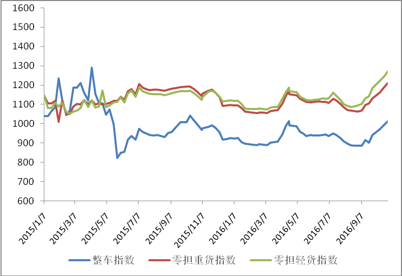 各車型指數(shù)環(huán)比均有不同程度回升,其中整車指數(shù)、零擔重貨運輸指數(shù)環(huán)比回升幅度略低于零擔輕貨指數(shù)。本周,整車指數(shù)為1012.7點,環(huán)比回升1.9%,比年初回升9.4%;零擔輕貨指數(shù)為1270.8點,環(huán)比回升2.0%;零擔重貨指數(shù)為1211.1點,環(huán)比回升1.9%。