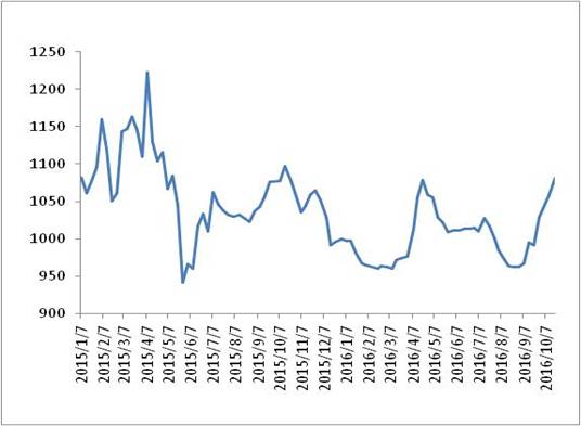 圖 1 2015-2016年各周中國公路物流運價指數(shù)