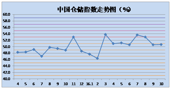 中國(guó)物流與采購(gòu)聯(lián)合會(huì)與中儲(chǔ)發(fā)展股份有限公司聯(lián)合調(diào)查的2016年10月中國(guó)倉(cāng)儲(chǔ)指數(shù)為50.7%,較上月回升0.1個(gè)百分點(diǎn),連續(xù)八個(gè)月位于擴(kuò)張區(qū)間。各分項(xiàng)指數(shù)中,設(shè)施利用率指數(shù)、主營(yíng)業(yè)務(wù)成本指數(shù)、期末庫(kù)存指數(shù)及企業(yè)員工指數(shù)較上月有所回升,其余指數(shù)均有不同程度的回落。
