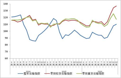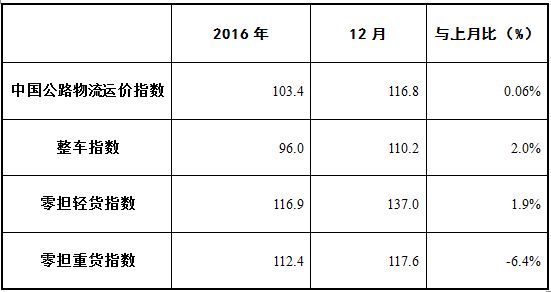 由中國物流與采購聯(lián)合會和林安物流集團(tuán)聯(lián)合調(diào)查的中國公路物流運價指數(shù)2016年12月為116.8點,比上月回升0.06%,運價指數(shù)連續(xù)四個月環(huán)比回升,比上年同期增長15.3%,全年總體高于去年同期水平。9月份以來,受到治超新政實施等因素影響,運輸費用持續(xù)上漲,加之物流需求穩(wěn)中有升,多重因素共同影響,帶動價格指數(shù)連續(xù)回升。