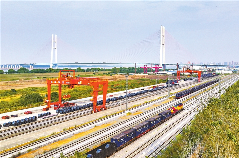 日前,位于九江經(jīng)濟(jì)技術(shù)開(kāi)發(fā)區(qū)的城西港鐵路專用線上,一列貨運(yùn)列車正在進(jìn)行裝卸作業(yè)。九江城西港區(qū)鐵路專用線是國(guó)家推動(dòng)長(zhǎng)江干線港口鐵水聯(lián)運(yùn)、設(shè)施聯(lián)通行動(dòng)計(jì)劃12條長(zhǎng)江干線重點(diǎn)鐵路項(xiàng)目之一。近年來(lái),隨著鐵路專用線開(kāi)通運(yùn)營(yíng),九江港與京九線等國(guó)鐵干線實(shí)現(xiàn)了無(wú)縫銜接,有效提升九江“公鐵水”聯(lián)運(yùn)、江海聯(lián)運(yùn)等多式聯(lián)運(yùn)水平,對(duì)促進(jìn)江西省在中部地區(qū)率先崛起、推動(dòng)長(zhǎng)江經(jīng)濟(jì)帶綠色發(fā)展具有重要意義。