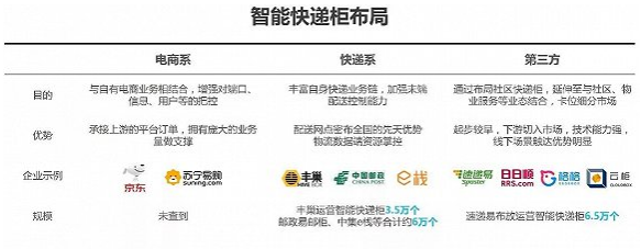 目前智能快遞柜市場(chǎng)入局者主要分為三類(lèi):京東、蘇寧等電商系;豐巢、郵政易郵柜等快遞系;速遞易、日日順、云柜等第三方,各有優(yōu)勢(shì)。隨著國(guó)家隊(duì)和阿里站隊(duì)速遞易、阿里投資的蘇寧和日日順也將逐漸統(tǒng)一陣營(yíng),豐巢背后則有順豐、騰訊、京東等的支持,三方勢(shì)力逐漸演化為兩大陣營(yíng)的對(duì)峙。