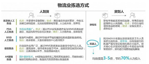 倉(cāng)儲(chǔ)物流的揀選一般有人到貨和貨到人兩種方式。人到貨方式中,當(dāng)前應(yīng)用最廣的是PDA人工揀選,語(yǔ)音揀選、AR眼鏡揀選等新興技術(shù)尚未在國(guó)內(nèi)普及。貨到人方式中,主要有穿梭車(chē)和揀選機(jī)器人兩種解決辦法,都是根據(jù)揀貨員指令,將所需的商品送到作業(yè)人員面前,節(jié)約行走和尋找時(shí)間。但前者設(shè)備投資大,柔性小。后者更加靈活,可根據(jù)實(shí)際需求,自主規(guī)劃,相對(duì)于人工揀選,機(jī)器人操作均效提高3-5倍,節(jié)約人力70%。