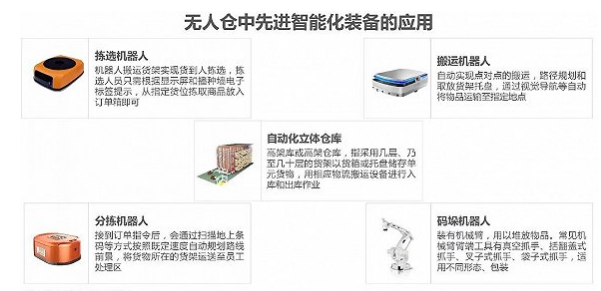 倉(cāng)儲(chǔ)行業(yè)正在變得更加自動(dòng)化和智能化,自動(dòng)化可以剛性提高效率,智能化可以滿足差異化、個(gè)性化需求,增強(qiáng)供應(yīng)鏈柔性。商品的入庫(kù)、儲(chǔ)存、揀選、分揀、出庫(kù)等一系列流程,在無(wú)人倉(cāng)中都可以用相應(yīng)的自動(dòng)化設(shè)備或者機(jī)器人替代。常見(jiàn)的有AGV機(jī)器人,根據(jù)不同用途又分為搬運(yùn)、揀選和分揀等不同類(lèi)型,以及專(zhuān)業(yè)從事碼垛工作的碼垛機(jī)器人。另外,RFID標(biāo)簽、立體倉(cāng)庫(kù)的應(yīng)用等均顯著減少成本費(fèi)用,提高了作業(yè)效率。