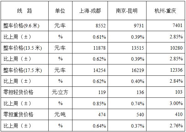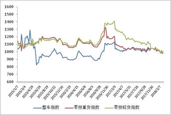 各車(chē)型指有不同程度回升,其中零擔(dān)指數(shù)環(huán)比回升幅度高于整車(chē)指數(shù)。其中,整車(chē)指數(shù)為985.8點(diǎn),比上周回升0.43%;零擔(dān)輕貨指數(shù)回升幅度高于零擔(dān)重貨指數(shù)。零擔(dān)重貨指數(shù)為984.71點(diǎn),環(huán)比回升0.45%;零擔(dān)輕貨指數(shù)為1008.62點(diǎn),環(huán)比回升0.71%。