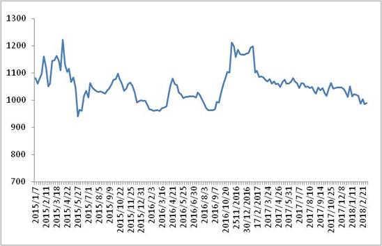 圖 1 2015-2018年各周中國(guó)公路物流運(yùn)價(jià)指數(shù)