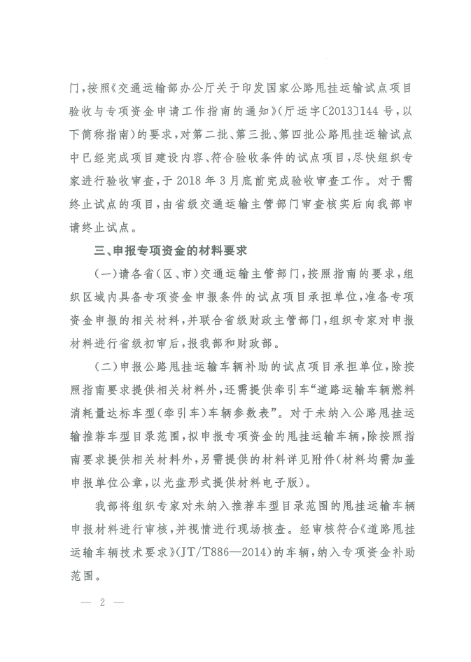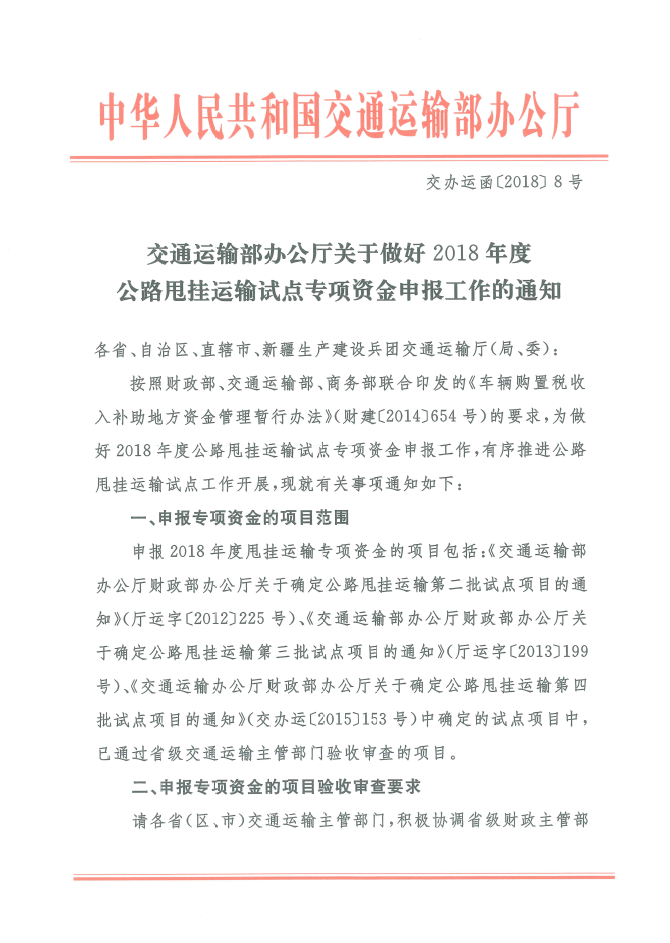 交通運輸部辦公廳關(guān)于做好2018年度公路甩掛運輸試點專項資金申報工作的通知