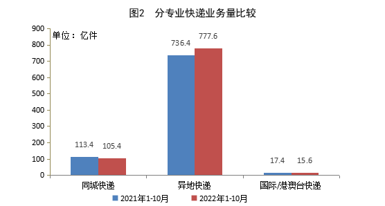 1-10月,同城快遞業(yè)務(wù)量累計(jì)完成105.4億件,同比下降7.0%;異地業(yè)務(wù)量累計(jì)完成777.6億件,同比增長(zhǎng)5.6%;國(guó)際/港澳臺(tái)業(yè)務(wù)量累計(jì)完成15.6億件,同比下降10.1%。