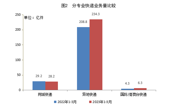 一季度,同城快遞業(yè)務量累計完成28.2億件,同比下降3.2%;異地快遞業(yè)務量累計完成234.3億件,同比增長12.2%;國際/港澳臺快遞業(yè)務量累計完成6.3億件,同比增長46.8%。