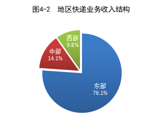 一季度,東、中、西部地區(qū)快遞業(yè)務量比重分別為75.9%、16.2%和7.9%,業(yè)務收入比重分別為76.1%、14.1%和9.8%。與去年同期相比,東部地區(qū)快遞業(yè)務量比重下降1.6個百分點,快遞業(yè)務收入比重下降1.2個百分點;中部地區(qū)快遞業(yè)務量比重上升1.0個百分點,快遞業(yè)務收入比重上升0.7個百分點;西部地區(qū)快遞業(yè)務量比重上升0.6個百分點,快遞業(yè)務收入比重上升0.5個百分點。