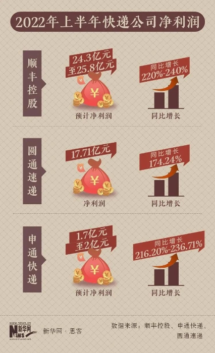 各大快遞公司也陸續(xù)發(fā)布上半年業(yè)績報告,顯示出市場整體回暖向好態(tài)勢。其中順豐控股(50.190, 0.40, 0.80%)實現(xiàn)凈利潤預計在24.3億元至25.8億元,同比增長220%至240%;圓通上半年實現(xiàn)凈利潤17.71億元,同比增長174.24%;申通也終于扭虧為盈,預計實現(xiàn)凈利潤1.7億元至2億元,同比增長216.20%至236.71%。