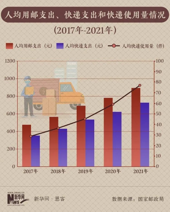 據(jù)國家郵政局數(shù)據(jù)顯示,2017-2021年人均用郵支出、快遞支出和快遞使用量每年都在增長,其中2021年人均快遞使用量為76.7件,年人均用郵支出895.0元,年人均快遞支出731.4元。按照第七次全國人口普查結果14.12億人推測,2021年平均每人每月快遞量超過6個。