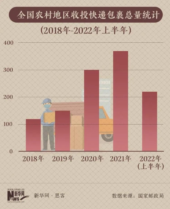 從上圖可以看出,2018年-2021年,全國農(nóng)村地區(qū)快遞包裹收投總量在逐年上升,由2018年的120億件上升到2021年的370億件。龐大的快遞包裹數(shù)據(jù)背后,是加速推進的“快遞進村”步伐和不斷增強的農(nóng)村經(jīng)濟活力,也讓人看到了農(nóng)村消費市場蘊藏的巨大潛力。