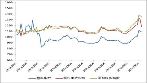 本周,隨著“雙十一”電商大促的熱潮過(guò)去,快消品公路物流需求較前期小幅回落,市場(chǎng)運(yùn)輸價(jià)格隨之有所回調(diào),但受到治超新政等因素的影響,價(jià)格總體仍高于上年同期水平。從后期走勢(shì)看,未來(lái)公路運(yùn)輸市場(chǎng)需求短期仍將保持較高水平,運(yùn)價(jià)指數(shù)將可能呈現(xiàn)震蕩回升的走勢(shì)。
