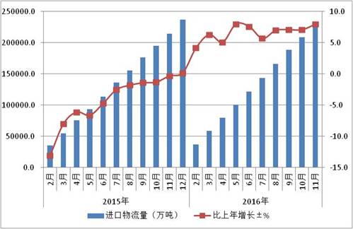 ---進(jìn)口物流需求有所好轉(zhuǎn)。1-11月,進(jìn)口物流總額9.3萬(wàn)億元,比上年同期下降0.3%,降幅繼續(xù)收窄,比1-10月收窄1.5個(gè)百分點(diǎn)。進(jìn)口物流量增速保持平穩(wěn)增長(zhǎng),比上年同期增長(zhǎng)8.0%,增速比1-10月提高0.9個(gè)百分點(diǎn)。從當(dāng)月情況看,11月當(dāng)月進(jìn)口物流總額1.0萬(wàn)億元,增長(zhǎng)13.0%,環(huán)比上月增長(zhǎng)19%,創(chuàng)2014年來(lái)最大的單月增幅,,顯示出當(dāng)前進(jìn)口物流需求止跌回升,回穩(wěn)向好的態(tài)勢(shì)。