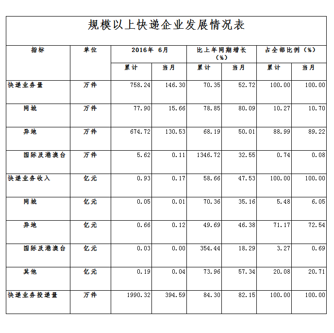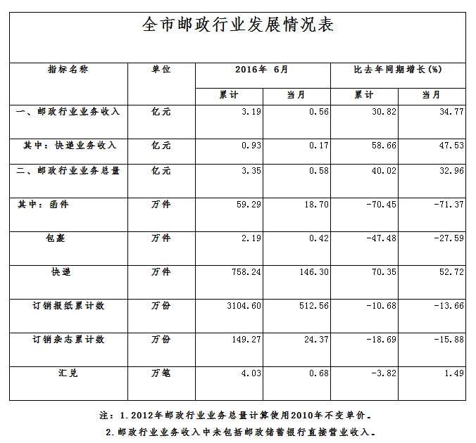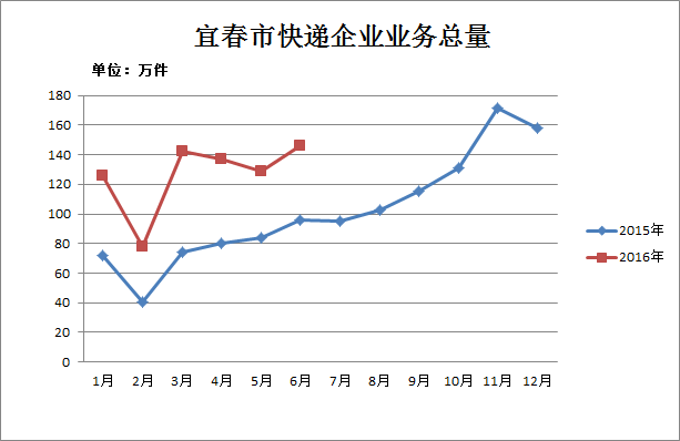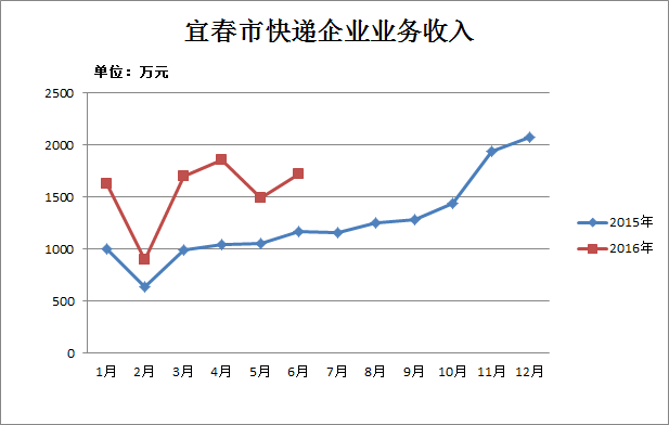 2016年1-6月,宜春市郵政企業(yè)和規(guī)模以上快遞服務企業(yè)業(yè)務收入(不包括郵政儲蓄銀行直接營業(yè)收入)累計3.19億元,同比增長30.82%;業(yè)務總量3.35億元,同比增長40.02%。