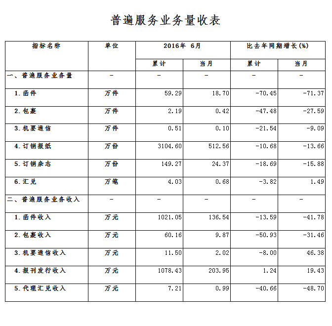 1-6月份,宜春市郵政函件業(yè)務累計完成59.29萬件,同比下降70.45%;包裹業(yè)務累計完成2.19萬件,同比下降47.48%;報紙業(yè)務累計完成3104.60萬份,同比下降10.68%;雜志業(yè)務累計完成140.27萬份,同比下降19.68%;匯兌業(yè)務累計完成4.03萬筆,同比下降3.82%。
