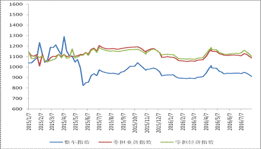 各車型指數(shù)環(huán)比有不同程度回落,其中零擔(dān)輕貨指數(shù)回落幅度高于整車指數(shù),整車指數(shù)回落幅度高于零擔(dān)重貨指數(shù)。本周,整車指數(shù)為911.4點,環(huán)比回落1.6%,比上年同期下降3.0%;零擔(dān)重貨指數(shù)為1087.1點,環(huán)比回落1.4%,比上年同期下降7.5%;零擔(dān)輕貨指數(shù)為1101.5點,環(huán)比回落2.0%,比上年同期下降4.3%。