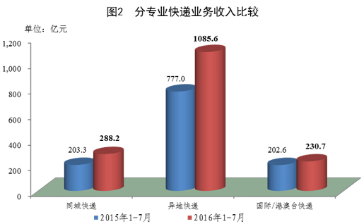 1-7月份,全國(guó)快遞服務(wù)企業(yè)業(yè)務(wù)量累計(jì)完成157.5億件,同比增長(zhǎng)55.9%;業(yè)務(wù)收入累計(jì)完成2026億元,同比增長(zhǎng)42.9%。其中,同城業(yè)務(wù)收入累計(jì)完成288.2億元,同比增長(zhǎng)41.8%;異地業(yè)務(wù)收入累計(jì)完成1085.6億元,同比增長(zhǎng)39.7%;國(guó)際/港澳臺(tái)業(yè)務(wù)收入累計(jì)完成230.7億元,同比增長(zhǎng)13.8%。