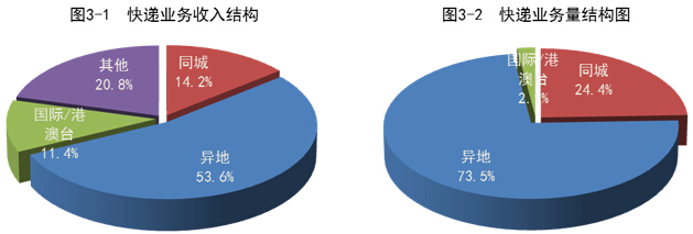 1-7月份,同城、異地、國際/港澳臺(tái)快遞業(yè)務(wù)收入分別占全部快遞收入的14.2%、53.6%和11.4%;業(yè)務(wù)量分別占全部快遞業(yè)務(wù)量的24.4%、73.5%和2.1%。與去年同期相比,同城快遞業(yè)務(wù)收入的比重下降0.1個(gè)百分點(diǎn),異地快遞業(yè)務(wù)收入的比重下降1.2個(gè)百分點(diǎn),國際/港澳臺(tái)業(yè)務(wù)收入的比重下降2.9個(gè)百分點(diǎn)。