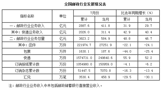1-7月份,郵政行業(yè)業(yè)務(wù)收入(不包括郵政儲(chǔ)蓄銀行直接營業(yè)收入)累計(jì)完成2887.6億元,同比增長31.9%;業(yè)務(wù)總量累計(jì)完成3823.2億元,同比增長48.8%。