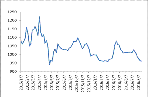 圖 1 2015-2016年各周中國公路物流運(yùn)價指數(shù)
