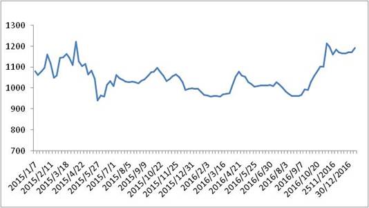 圖 1 2016-2017年各周中國(guó)公路物流運(yùn)價(jià)指數(shù)