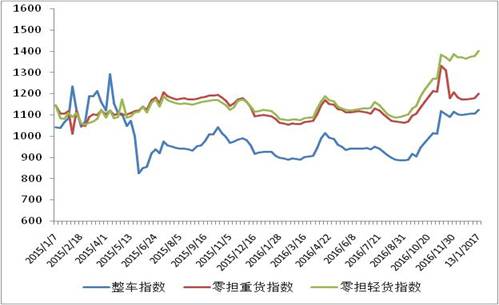 各車型指數(shù)環(huán)比均有不同程度回升,其中零擔(dān)輕貨指數(shù)回升幅度相對(duì)較高。其中,整車指數(shù)為1124.7點(diǎn),環(huán)比回升1.7%,比上年同期增長(zhǎng)21.5%;零擔(dān)輕貨指數(shù)為1400.3點(diǎn),環(huán)比回升1.8%;零擔(dān)重貨指數(shù)為1198.7點(diǎn),環(huán)比回升1.7%。