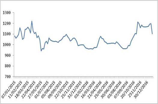 圖1 2016-2017年各周中國公路物流運(yùn)價(jià)指數(shù)