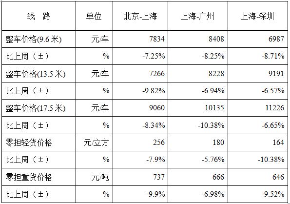 本周為春節(jié)后第一周,因部分企業(yè)尚未恢復(fù)生產(chǎn)建設(shè),公路物流市場(chǎng)需求總體較為平淡,各地區(qū)供大于求的局面較為普遍,價(jià)格指數(shù)回落幅度較大。從后期走勢(shì)看,隨著正月十五后企業(yè)恢復(fù)生產(chǎn),公路運(yùn)輸市場(chǎng)需求也將回暖,運(yùn)價(jià)指數(shù)將呈現(xiàn)回升走勢(shì)。