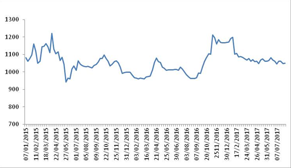 圖 1 2015-2017年各周中國公路物流運價指數(shù)
