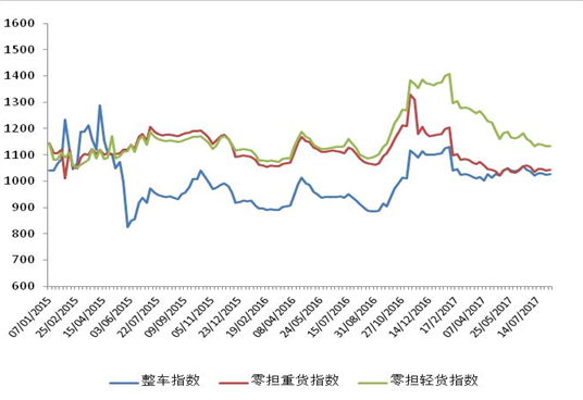 各車型指數(shù)波動幅度較小但均有不同程度回升。其中,整車指數(shù)為1025.99點,比上周回升0.16%,比上年同期增長12.57%;零擔(dān)輕貨指數(shù)為1133.51點,環(huán)比回升0.03%;零擔(dān)重貨指數(shù)為1042.63點,環(huán)比回升0.15%。
