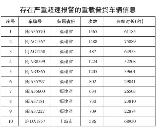 上海、福建兩省(市)4輛客車、7輛危貨車輛、10輛重載普貨車輛車載終端存在嚴(yán)重的超速報警,涉嫌違規(guī)超速行駛;13輛客車、10輛重載普貨車輛系統(tǒng)平臺存在較嚴(yán)重的疲勞駕駛報警,涉嫌違規(guī)疲勞駕駛;6輛客車23時至次日2時存在未??啃袨?,涉嫌違反接駁運輸管理規(guī)定;6輛危貨車輛軌跡完整率低于80%。