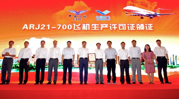 7月9日,民航局在京向中國商用飛機有限責任公司(以下簡稱中國商飛)頒發(fā)ARJ21-700飛機生產(chǎn)許可證,標志著該機型正式進入批量生產(chǎn)階段。民航局副局長李健、中國商飛總經(jīng)理賀東風、工業(yè)和信息化部裝備工業(yè)司副司長楊拴昌等出席頒證活動。