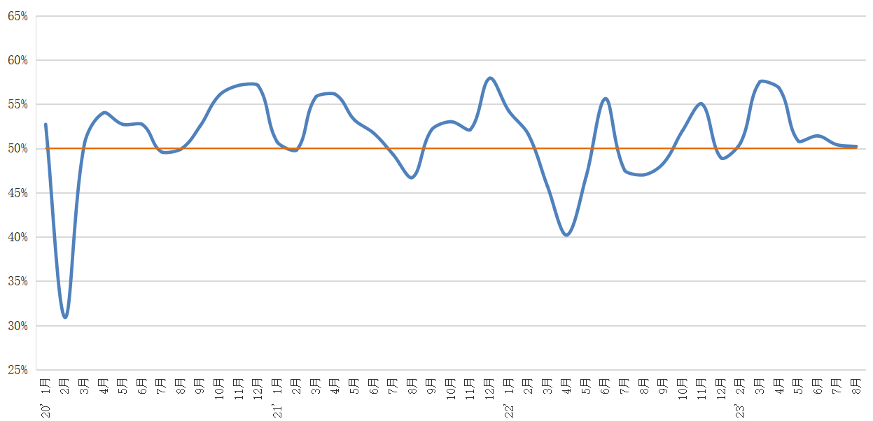 二、庫存周轉(zhuǎn)次數(shù)指數(shù)保持景氣水平。8月份,全省庫存周轉(zhuǎn)次數(shù)指數(shù)為50.4%,環(huán)比回落1.3個百分點,但仍保持在擴張區(qū)間。顯示出庫存周轉(zhuǎn)效率雖有所回落但仍保持高效,貨物進出庫速率保持穩(wěn)定。從物流服務(wù)品類上看,大宗商品、汽車庫存周轉(zhuǎn)次數(shù)指數(shù)有所回升,農(nóng)產(chǎn)品、快速消費品庫存周轉(zhuǎn)次數(shù)指數(shù)保持在擴張區(qū)間。
