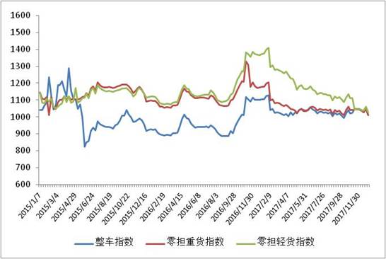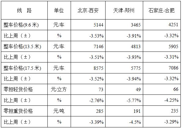 各車型指數(shù)均有不同程度回落,其中整車指數(shù)回落幅度高于零擔指數(shù),在零擔指數(shù)中零擔重貨指數(shù)回落幅度高于零擔輕貨指數(shù)。其中,整車指數(shù)為1012.25點,比上周回落3.54%;零擔輕貨指數(shù)為1025.87點,環(huán)比回落3.39%;零擔重貨指數(shù)為1010.69點,環(huán)比回落3.49%。