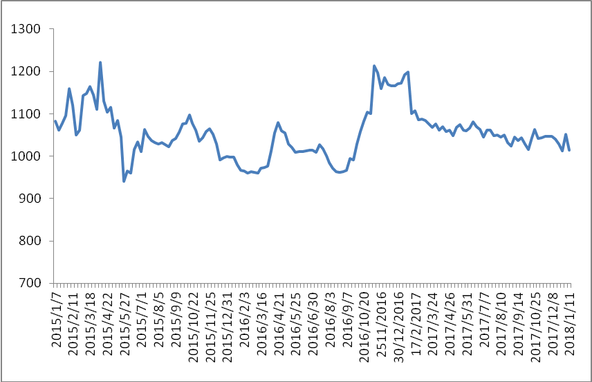 圖 1 2015-2018年各周中國公路物流運價指數(shù)