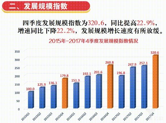 從四個(gè)一級指標(biāo)來看,2017年四季度發(fā)展規(guī)模指數(shù)為320.6,同比提高22.9%。四季度,網(wǎng)絡(luò)購物所產(chǎn)生的快遞量占快遞業(yè)務(wù)總量的近七成,比三季度提高近10個(gè)百分點(diǎn);全國快遞業(yè)務(wù)量約完成126.6億件,同比增長24.3%,占全年的比重達(dá)31.6%,為全年最高;日均快件處理量接近1.4億件,“雙11”期間最高日處理量3.3億件,同比增長31.5%。