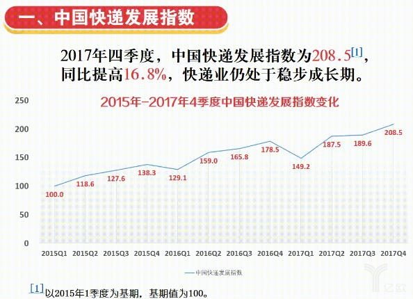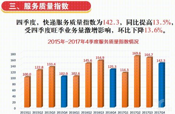2017年四季度,中國快遞發(fā)展指數(shù)為208.5,同比提高16.8%,快遞業(yè)仍處于穩(wěn)步成長期,呈現(xiàn)出發(fā)展態(tài)勢高位運(yùn)行,市場結(jié)構(gòu)持續(xù)優(yōu)化,資源要素加速集聚,網(wǎng)絡(luò)穩(wěn)步向下延伸,服務(wù)能力顯著增強(qiáng)的特點(diǎn),較好地應(yīng)對了旺季快遞服務(wù)需求,快遞準(zhǔn)公共服務(wù)屬性凸顯。據(jù)國家郵政局發(fā)展研究中心市場監(jiān)管研究處負(fù)責(zé)人耿艷介紹,2018年中國快遞發(fā)展指數(shù)將調(diào)整優(yōu)化指標(biāo)體系,加大發(fā)布頻次,月度快遞發(fā)展指數(shù)將于2月初首次與公眾見面。