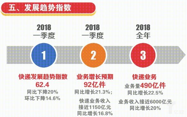 此外,受春節(jié)預(yù)期因素影響,快遞發(fā)展趨勢指數(shù)為62.4,同比下降20%,環(huán)比下降14.6%。在業(yè)務(wù)增長預(yù)期方面,預(yù)計(jì)2018年一季度業(yè)務(wù)量將達(dá)到92億件,同比增長21.3%;快遞業(yè)務(wù)收入將接近1150億元,同比增長16.8%。預(yù)計(jì)全年完成快遞業(yè)務(wù)量490億件,同比增長22.5%;全年快遞業(yè)務(wù)收入接近6000億元,同比增長20%。