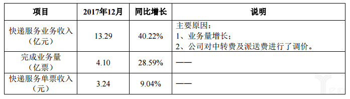 根據(jù)申通快遞公告,公司2017年12月快遞服務(wù)業(yè)務(wù)收入13.29億元,同比增長40.22%;完成業(yè)務(wù)量4.10億票,同比增長28.59%;快遞服務(wù)單票收入3.24元,同比增長9.04%。對于業(yè)績增長原因,申通表示,公司對中轉(zhuǎn)費(fèi)及派送費(fèi)進(jìn)行了調(diào)價(jià),同時(shí)12月份業(yè)務(wù)量同比也在增長。